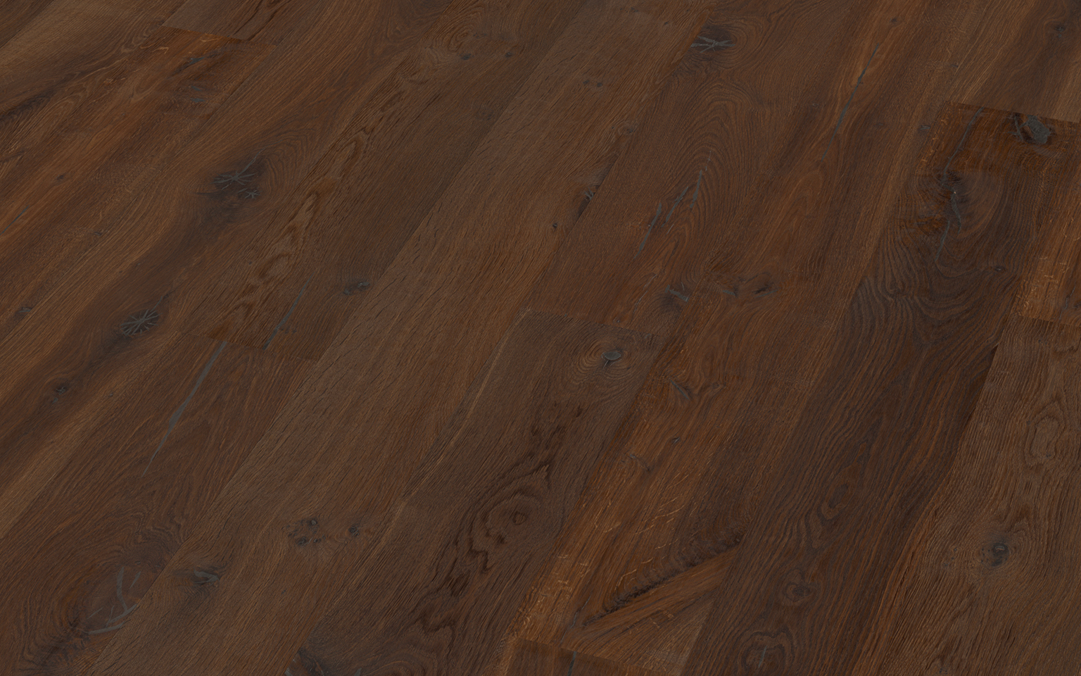 Der Eiche Darkbrown Parkettboden besticht durch seinen satten, dunklen Braunton. Dieser entsteht durch das sogenannte Räuchern — dabei reagiert das Eichenholz mit natürlichen Stoffen und dunkelt gleichmäßig nach, ganz ohne künstliche Farbe. Anschließend wurde die Oberfläche gebürstet, um die Holzmaserung spürbar hervorzuheben, und mit Öl versiegelt. Das Ergebnis ist ein wohnfertiger Boden mit warmem, tiefem Farbton und angenehmer Haptik.