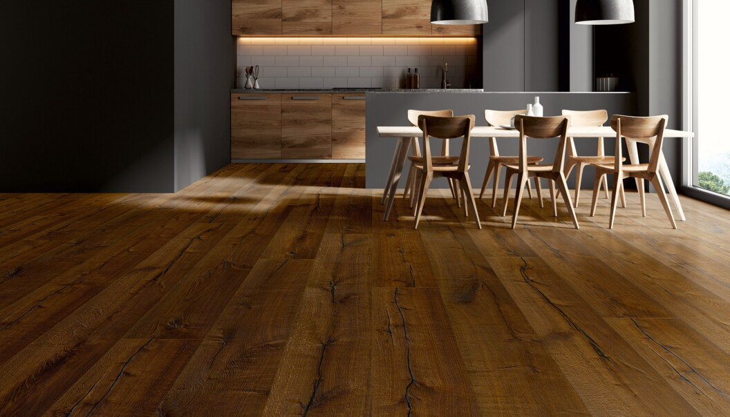 Dieser Eiche XXL Rustikal Parkettboden setzt mit seinen besonders großen Dielen ein beeindruckendes Statement in jedem Raum. Die Oberfläche ist tief gebürstet — das heißt, die weicheren Holzfasern wurden besonders intensiv herausgearbeitet, was eine deutlich fühlbare, dreidimensionale Struktur ergibt. Durch das anschließende dunkle Räuchern und Ölen erhält der Boden einen satten, dunklen Charakter mit antiker Ausstrahlung. Sichtbare Längsrisse gehören gewollt zum Erscheinungsbild und verstärken den rustikalen Altholz-Look.